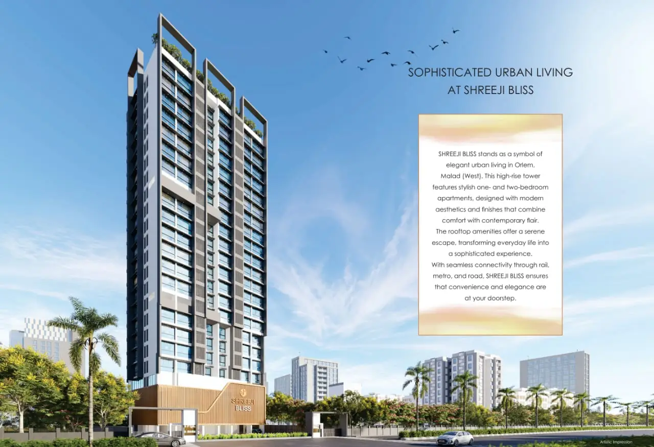 About Shreeji Bliss: SHREEJI BLISS stands as a symbol of elegant urban living in Orlem, Malad (West). This high-rise tower features stylish one-and two-bedroom apartments, designed with modern aesthetics and finishes that combine comfort with contemporary flair. The rooftop amenities offer a serene escape, transforming everyday life into a sophisticated experience. With seamless connectivity through rail, metro. and road, SHREEJI BLISS ensures that convenience and elegance are at your doorstep.